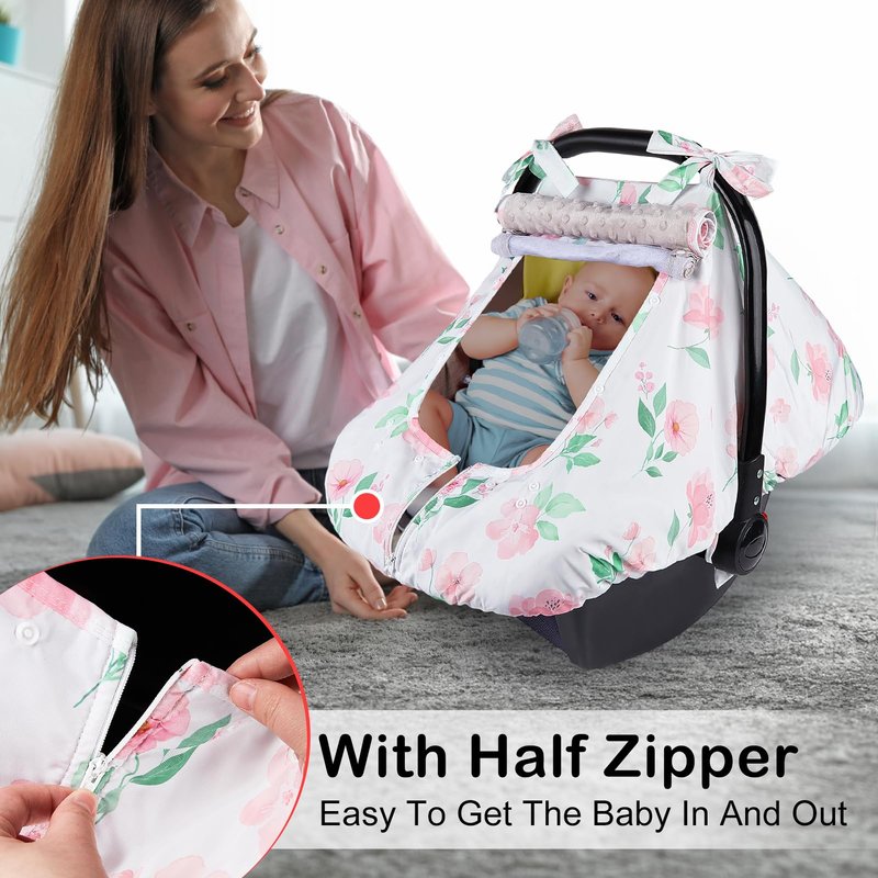 - Unique Design: With an inventive half-zip design, our car seat canopy allows you to get your baby in and out easily without removing the entire cover. The bottom elastic band prevents wind, and the side ties keep it securely fastened to the handle, preventing wind. Two top hooks ensure a secure and tight fit.