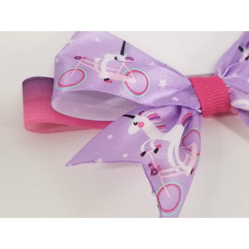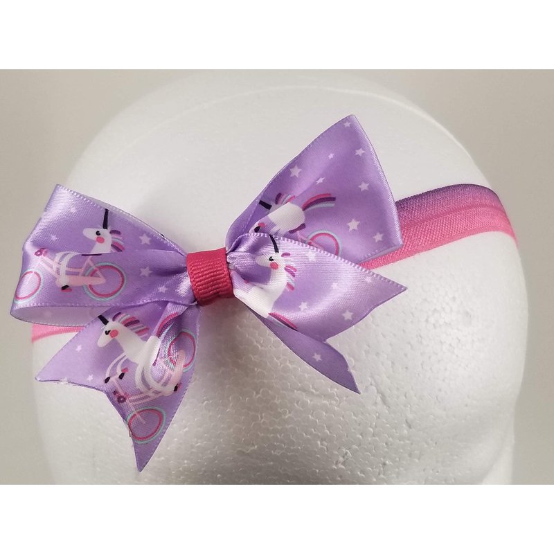 All my hair bows are made with quality decorative ribbons and sturdy metal alligator clips. They are a great accessory to many outfits. Alligator clips are great to keep the bows in the hair securely. Each hair bow measures approx. 3-5 inches across, and the headband ranges from 13" to 15" (0-6 mo to 6-18 mo) which you will choose before purchase. Each bow will vary slightly depending on where the pattern/logo lays out.
