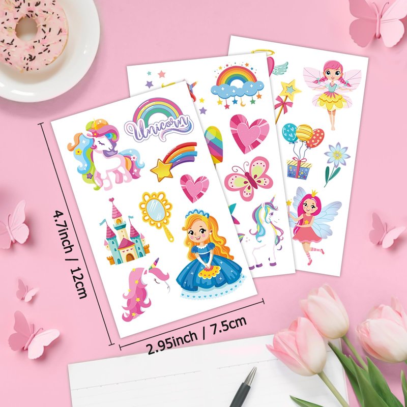 - ENDLESS FUN: 36 sheets temporary tattoo for kids with cute unicorn princess rainbow crown castle butterfly wizard's wand designs for hours of creative self-expression.