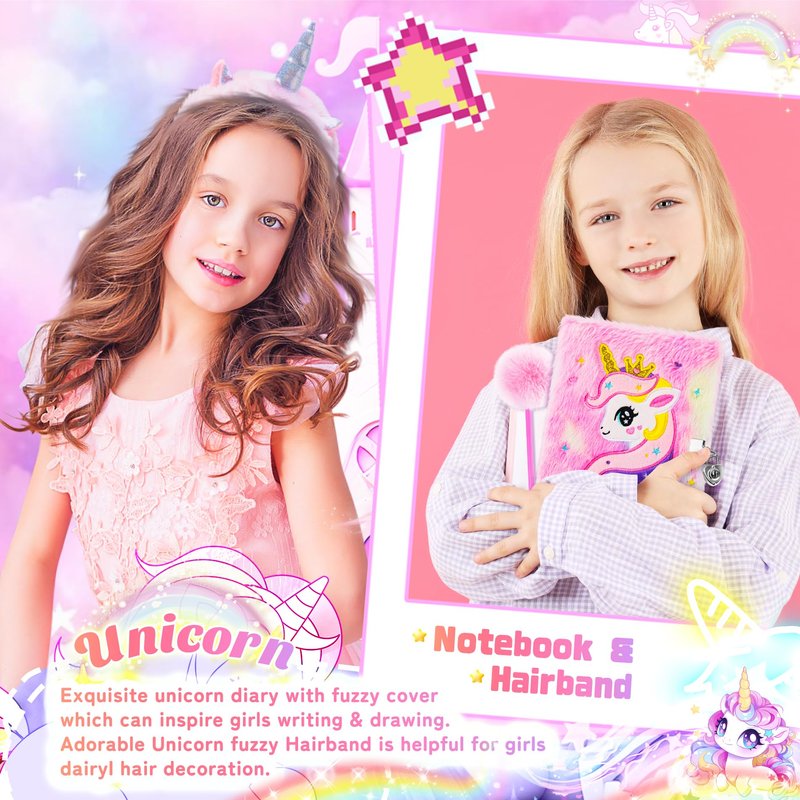 - FANTASTIC JOURNAL WITH LOCK, FLUFFY PEN-The unicorn notebook is made of natural non-toxic paper comfortable plush material, is super cute, can be used for diary, bookkeeping, and timetable. This locked journal with 2 keys will keep privacy and secrets safe. Girls can write down their valuable thoughts, memories and fun experience in the journal, then lock the diary, Let your kids go on a creative journal adventure and enjoy your child's colorful life and ideas with this perfect girls toys.