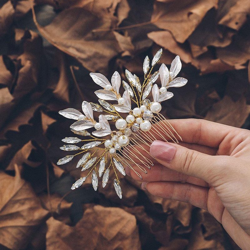 - Gold leaves hair comb in unique design and excellent workmanship, made of crystal, pearls, and leaf