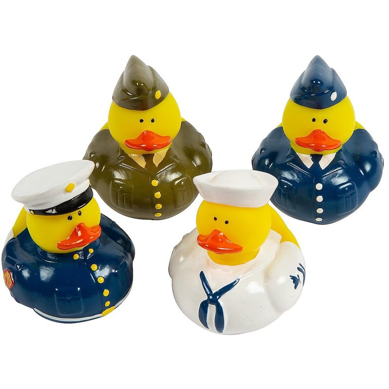 - Military Rubber Duckies feature Four types of Military Themed ducks wearing uniforms and hats. Send them on special missions to protect your imagination. Vinyl. 2 1/4" Duckies do not float upright