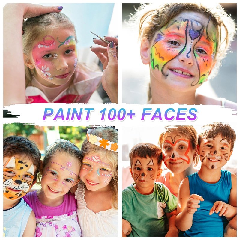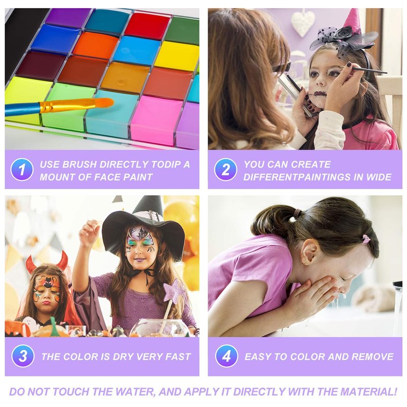 - 【Easy to Use】-You can use brush directly to dip a mount of face paint,then can create different fun paintings on your face or body, the color is dry very fast,also easy to color and remove.Use a makeup remover oil or professional waterproof makeup remover and gently wipe off, then wash with soap and water.
