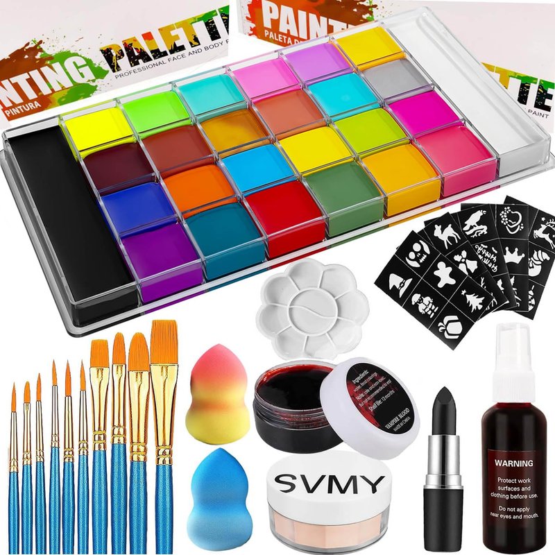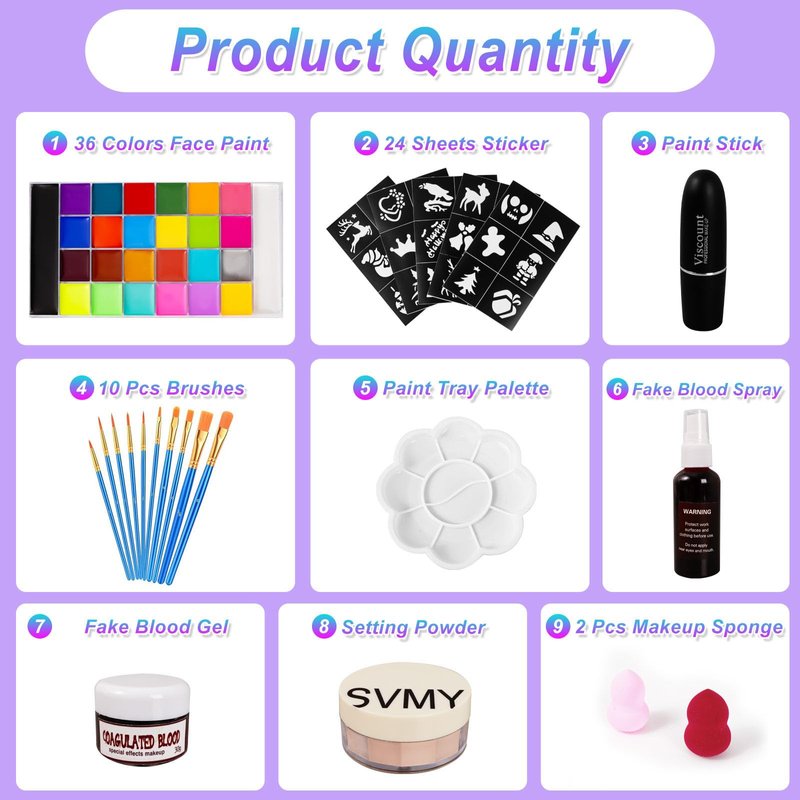 - 【Halloween Full Makeup Set】9-in-1 Professional Makeup Set including 26 Colors Face Paint/Paint Stick/ Brushes/ Special Effects Sticker for Halloween/Fake Blood Spray/Fake Blood Gel/Paint Tray Palette/Setting Powder/Makeup Sponge.
