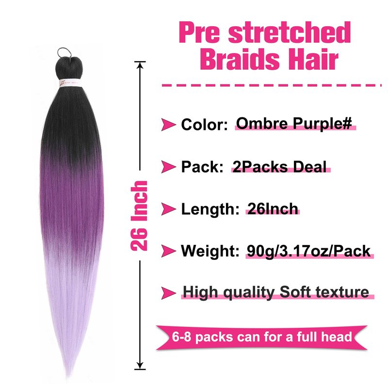 Unionbeauty 26 Inch Black to Purple Ombre Braiding 2Packs Pre Stretched Crochet Braid Kanekalon Easy Braid Hair Extensions Synthetic Braiding Hair for Goddess Box Braids Yaki Texture Hot Water Setting