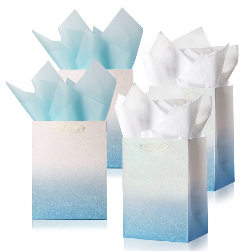 - 🛍 GIFT WRAPPING IS AS IMPORTANT AS GIFT- This modern minimalist pastel sparkling blue gift bag set comes in pack of 12, sized 9x7x4 In w/ 12 blue & 12 white tissue paper. Easy to fit book sized gifts like tablet, candle, mug, can safely hold up 5-8 lbs weight and protect your gift and party goodies. Dazzle loved ones with your tasteful choice of these stunning blue gift wrap bags. Make your gift-giving experience extra special when they receive your gifts in such beautiful packaging.
