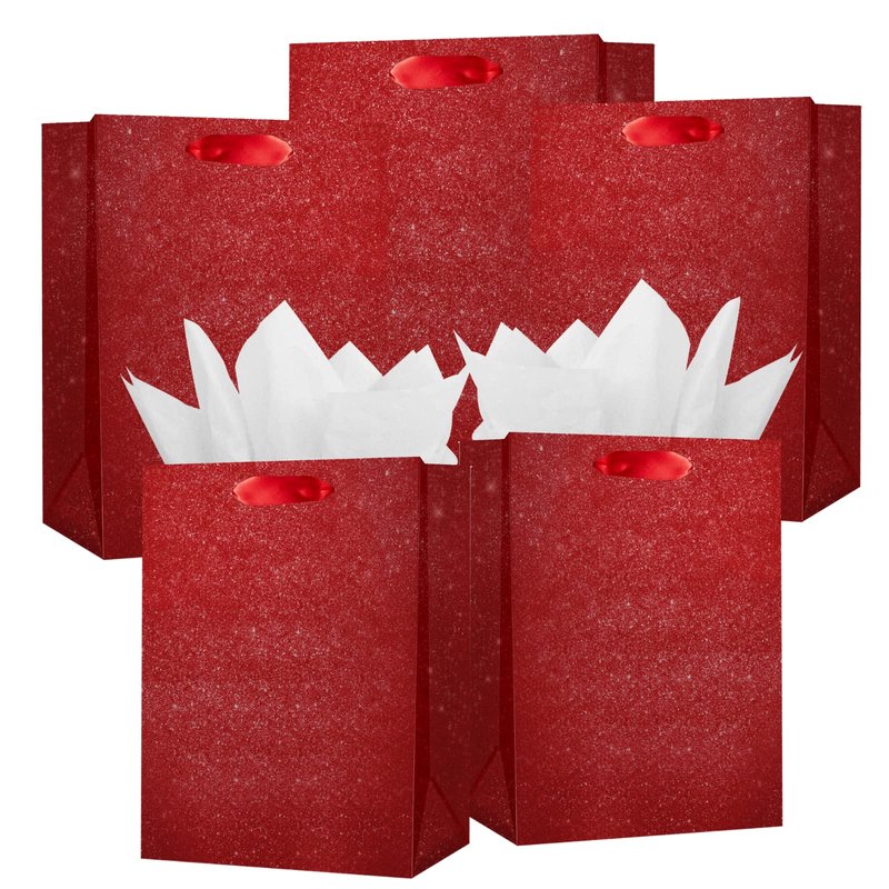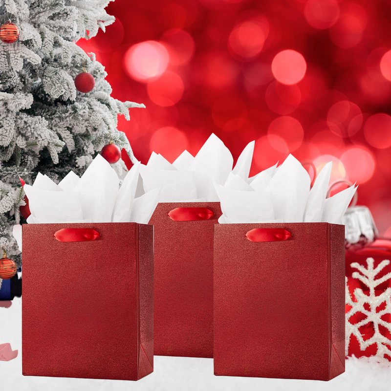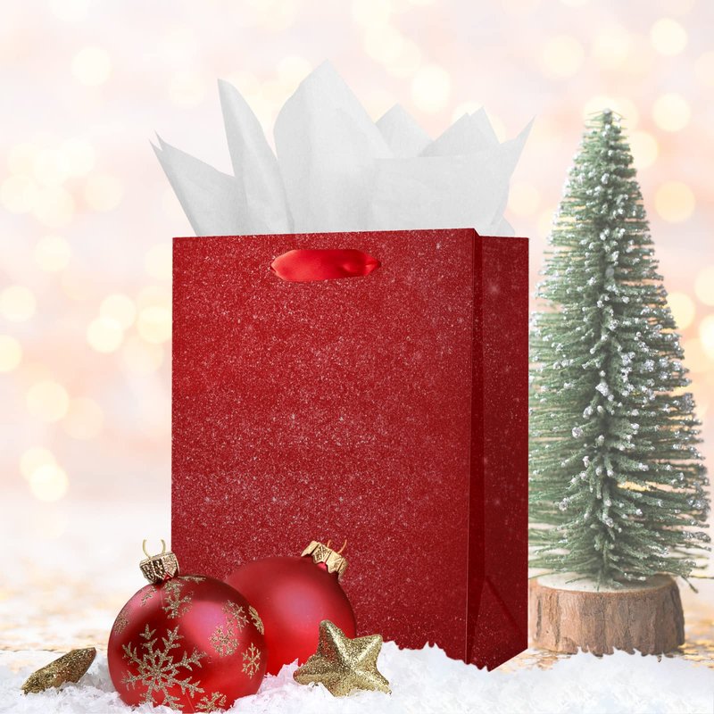 Package includes 12 Red Glitter Paper Gift Bag and 24 White Tissue Wrapping Paper. Total 36Pcs