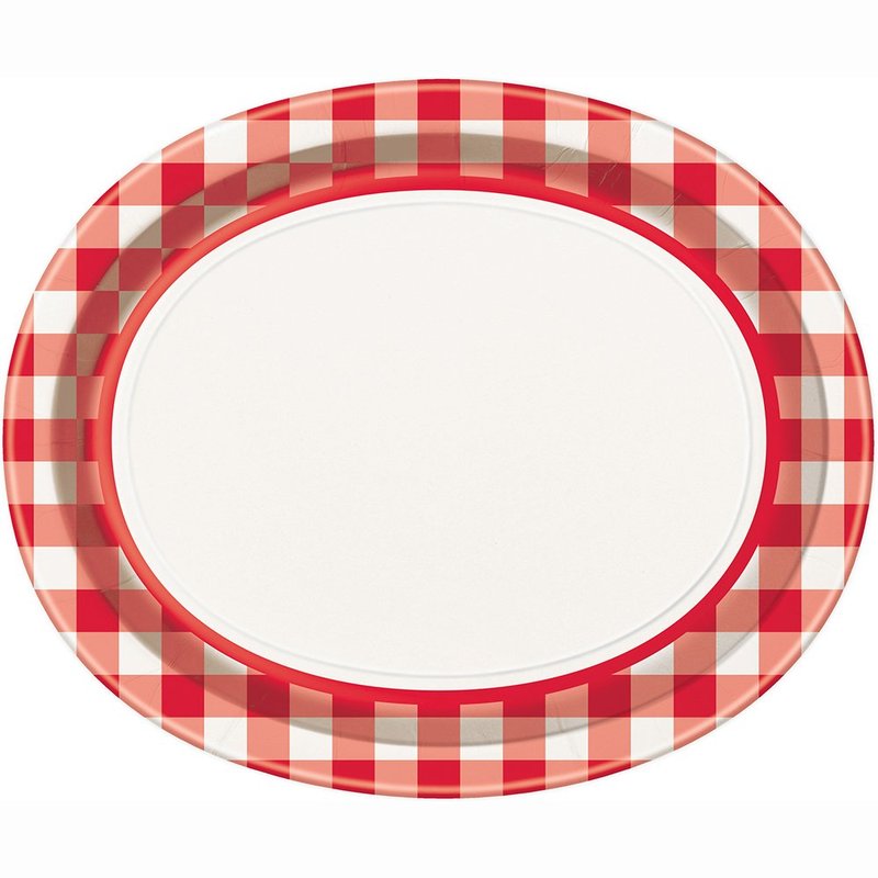 Unique 12.25" x 10.25" Gingham Oval Paper Plates 8 Pcs, Red