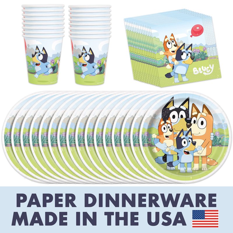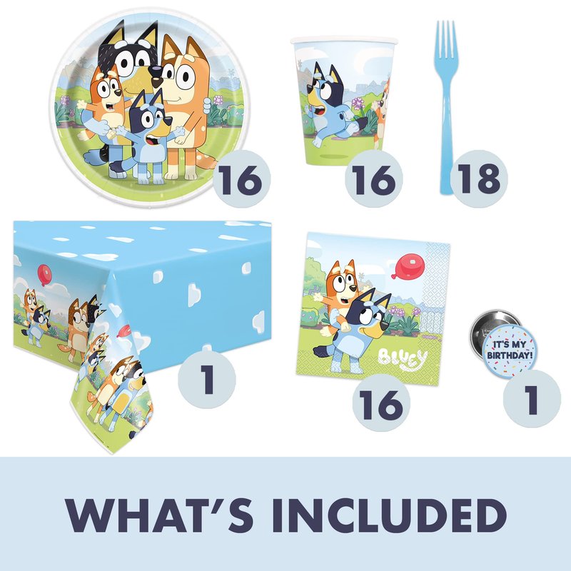 - Dinnerware -- This Bluey party decorations set includes enough Bluey birthday decorations to host a party of 16 guests: 1 table cover, 16 large 9" paper Bluey plates, 16 paper Bluey cups, 16 paper Bluey napkins, 18 coordinating blue forks and 1 It's My Birthday button.