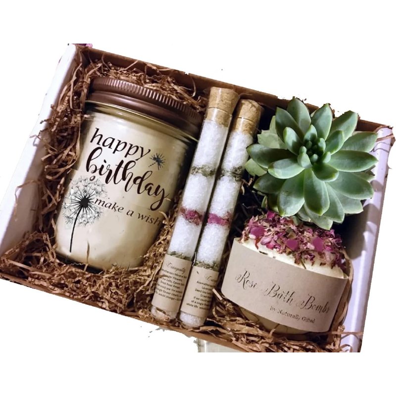 Every year, when a special birthday comes up, we like to show how grateful we are that all those years ago, something great happened: they were born. Every birthday is special but there are some birthdays that are extra special, handmade spa gift. Gift Set Includes ♥Rose & Lavender Epsom salt & Dead Sea Salt Bath Tubes ♥Rose & Lavender topped 4 oz Bath Bomb ♥Soy 8 oz Candle ♥Live 2.5" Succulent ♥Boxed in kraft shred ♥Beautiful card with your message