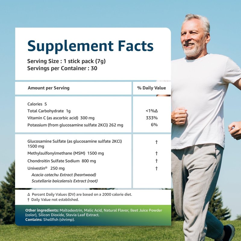 Rediscover life without joint pain with our unique raspberry flavored dietary supplement. Harnessing the power of Univestin, glucosamine, MSM, and chondroitin, our formula offers rapid relief and lasting results. Join the journey to relief today! Experience the fast-acting relief from Univestin with scientific data showing Improved Flexibility within 3 days, Enhanced Joint comfort within 5 days and Enhanced range of motion within 7 Days.