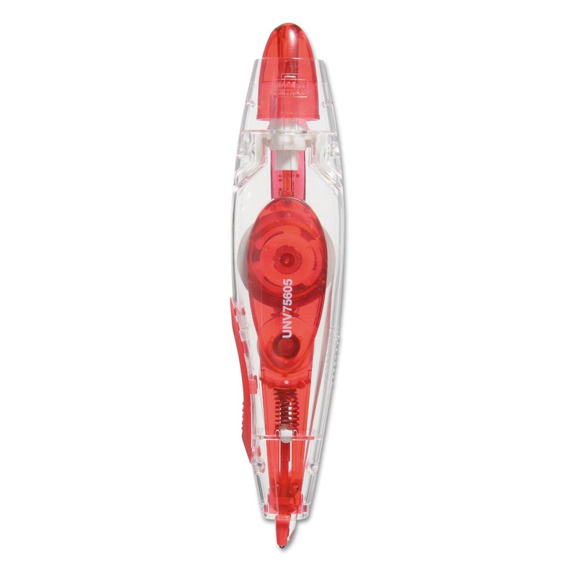 Pen-style correction tape dispenser is ergonomically designed to fit your hand for maximum comfort. Two-way function provides flexibility--pull the applicator to the right for correcting whole sentences, or push to the left if you only need to correct a single letter. Retractable tip cover protects tape when not in use. Great for left- or right-handed use. Line Coverage: 1; Tape Width: 1/5"; Tape Length: 236"; Case Color(s): Clear/Green.