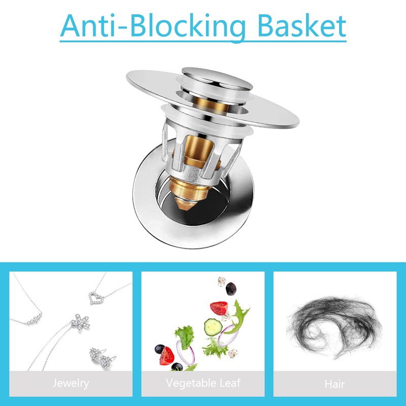 - 💦[ with Hair Catcher ] The drain plug with an anti-blocking basket strainer inside which can collect hairs and prevent the drain from clogging up, achieving effective filtering, unlike regular push button drain. Suitable for bathtub, bathroom and kitchen sink, and so on.