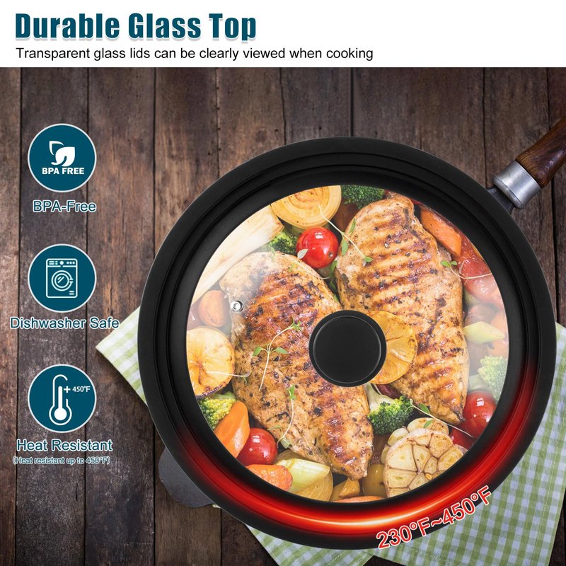 - 【Food Grade Silicone & Durable Glass】The universal pan lid is made from premium tempered glass and 100% food grade silicone. It provides a safer and stronger alternative to regular glass lids, with no risk of metal rusting. The silicone outer ring and anti-slip knob are heat-resistant up to 450°F, ensuring durability and reliability.