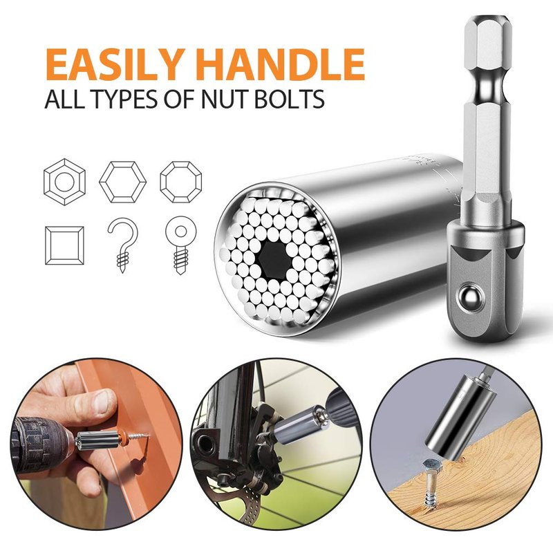 - UNIVERSAL & SELF-ADJUSTING: This universal socket can be self-adjusting immediately to grasp most metric, wing nuts, broken nuts, stripped nuts, eye bolts, square nuts, hexes, etc. Basically, you place the tool over virtually any nut or bolt and the socket gift set automatically conforms to the shape, allowing you to begin work without fussing over selecting the right size socket. And it is easy to connect with most electric drills, electric screwdrivers, and manual socket.