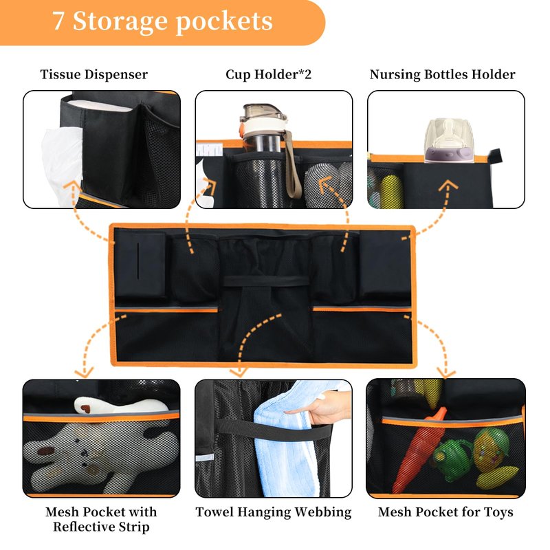 - [ 10 Pockets ] There are two cloth pockets specifically for tissues, water bottles and milk bottles; 5 mesh pockets of different sizes can meet the storage needs of water bottles, towels, toys, etc. Two large mesh pockets are also designed on the back to provide additional storage space
