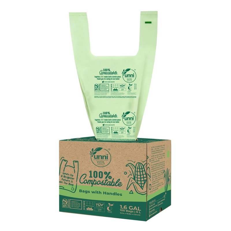 UNNI Compostable Bags with Handles, 1.2-1.6 Gallon, 6 Liter, 100 Count, 0.64 Mil, Samll Kitchen Food Scrap Waste Bags, T-Shirt Bags, ASTM D6400, US BPI, CMA & OK Compost Home Certified, San Francisco