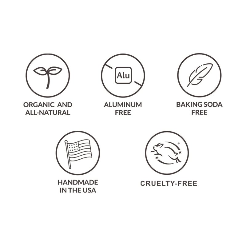 Not stinky. Not sticky. Not toxic. Our natural deodorant is formulated with magnesium and activated charcoal for sensitive skin, without baking soda. SCENT: product has an extremely mild herbal scent, not noticeable when applied. INGREDIENTS: magnesium hydroxide, extra virgin olive oil, calendula and lavender flowers, coconut oil, shea butter, arrowroot powder, meadowfoam oil, mango butter, beeswax, candelilla wax, plantain oil, sea buckthorn oil, vitamin E, activated charcoal, essential oils: thyme, tea tree, lavender, lemon.