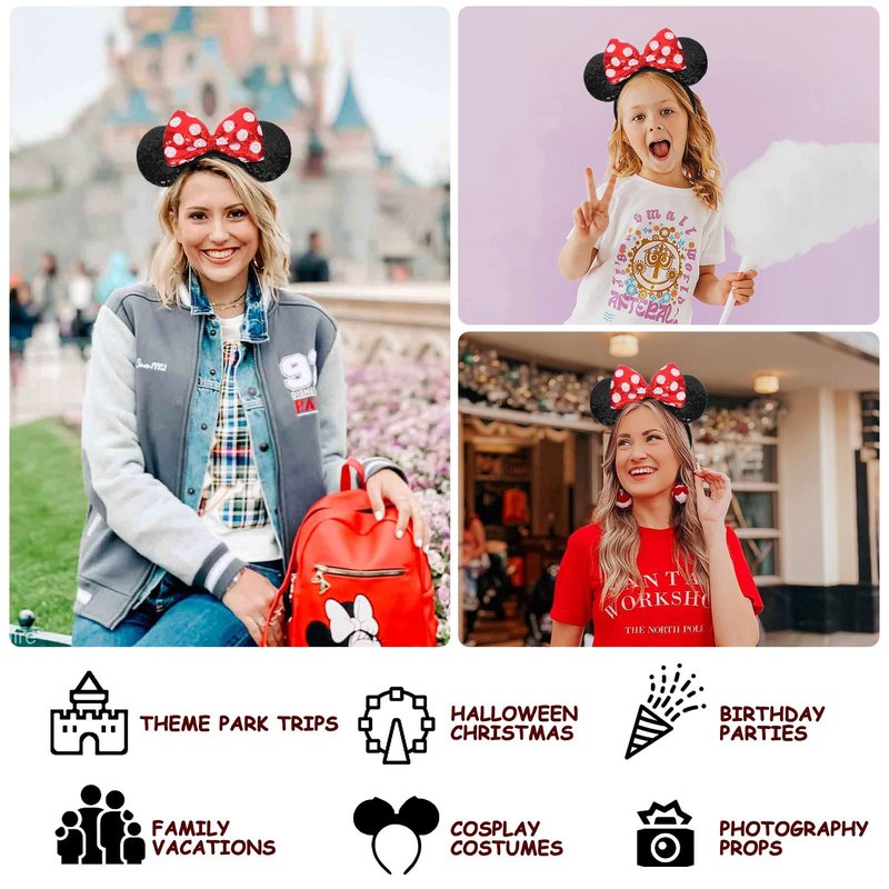 - 【Classic and Special Design】Featuring white polka dots and red bows, these mouse ears will never go out of style. Double sequins erect ears and big bows make mouse ears more three-dimensional. You can't go wrong starting your day with these classic polka dots and red bow mouse ears.