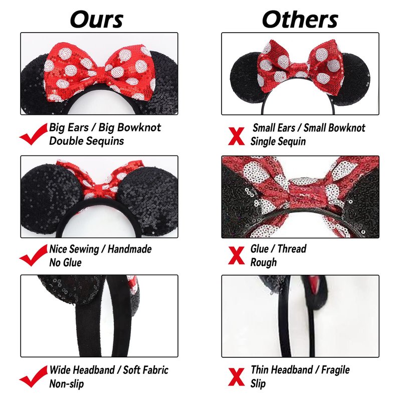 - 【Upgraded Materials and Size】Our mouse ears headbands are all handmade. We widen the headbands to ensure that mouse ears aren't easy to slide off your head. Soft fabric warping on the headband makes you wear mouse ears all day without getting a headache. Puffy bows and double sequins ears sewn on the headband are bigger than normal, which makes you look more gorgeous and attractive!