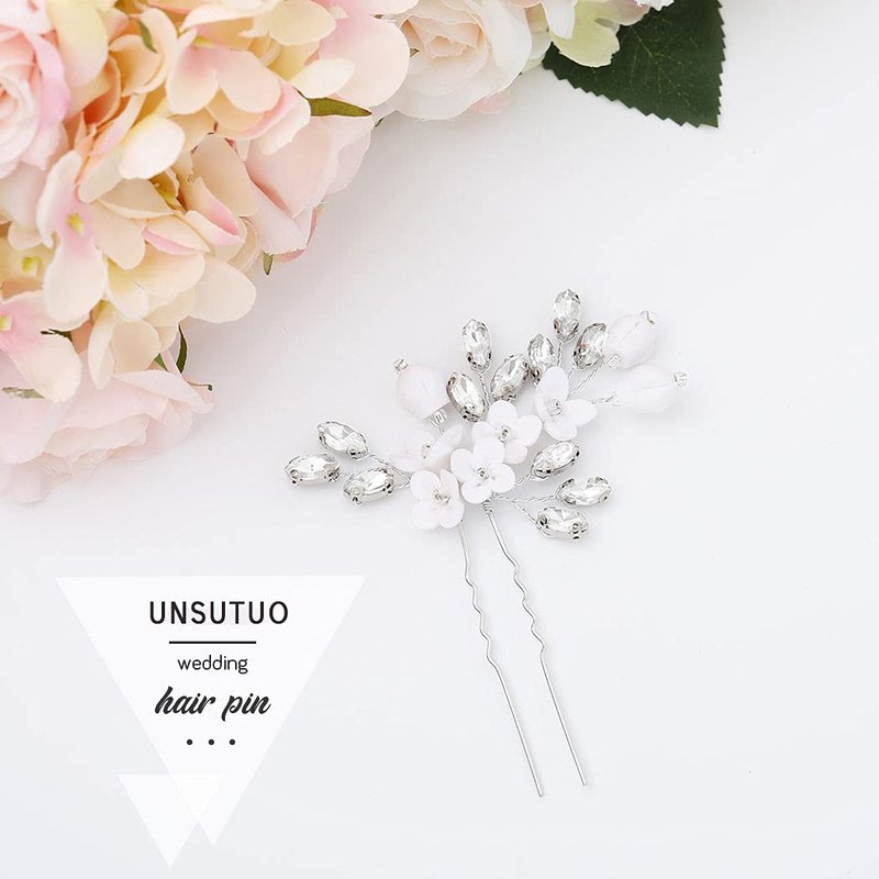 UNSUTUO Bride White Flower Wedding Hair Pins Clips Rhinestone Silver Bridal Hair Piece Accessories for Women, Set of 3 (Silver)