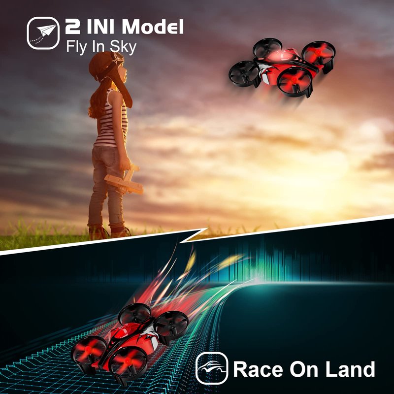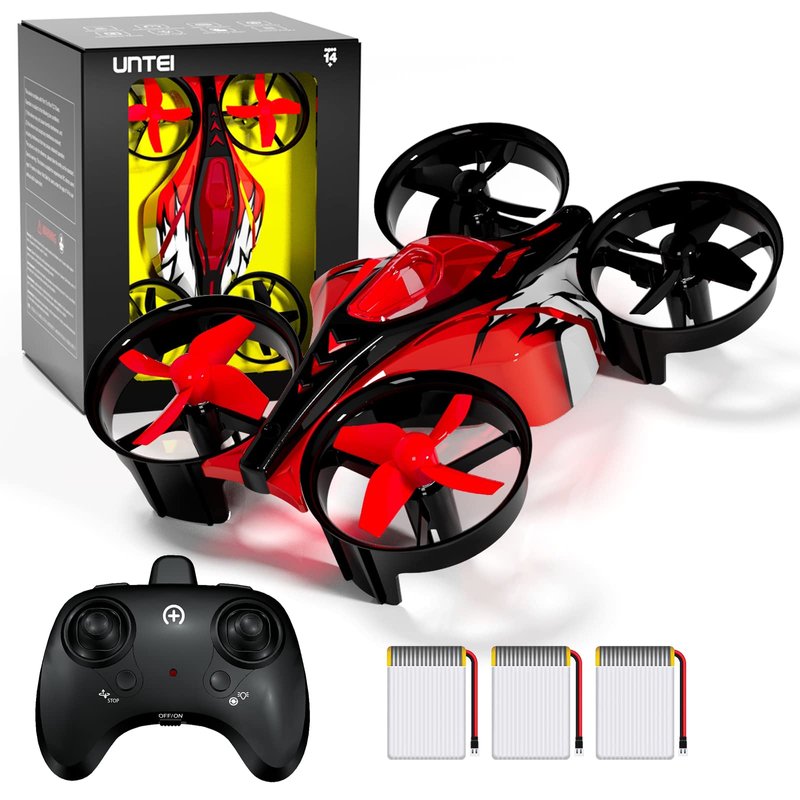 UNTEI 2 In 1 Mini Drones for Kids Remote Control Drone with Land Mode or Fly Mode, LED Lights,Auto Hovering, 3D Flip,Headless Mode and 3 Batteries,Toys Gifts for Boys Girls (Red)