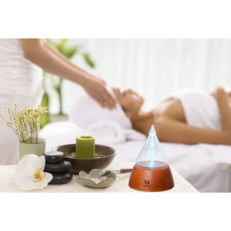 The UONE Aroma Essential Oil Nebulizer uses no water or heat to function keeping the essential oil in its natural state as it becomes a mist. The diffuser is made of natural wood and hand-blown glass external components with no plastic parts to corrode when in contact with the oils like most other diffusers.