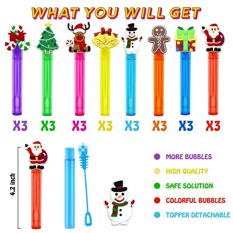 - Christmas Theme Bubble Wand Set Include-Bubble soap liquid set of 24pcs mini bubble wands,8 colors(3 pieces per color).As party supplies reunion fun for kids,add Christmas mood can add sparkle to your Christmas eve party