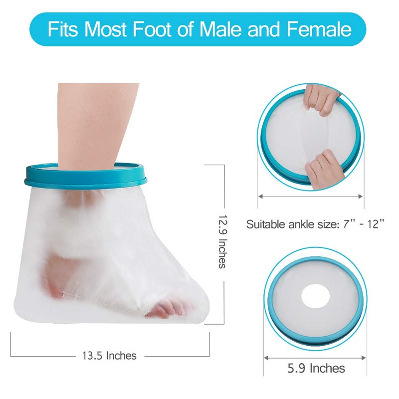 - ✔️【Patented design】Safe and convenient for shower or bath. Easily slide on the foot cast protector before bathing or showering to prevent water from damaging your cast and irritating your skin. Center hole fits ankle circumference from 7’' to 12.5’’. Foot cast cover fits most men and women to use. Item stretch size:13.5"(L)*12.9"(H)*7"(W).