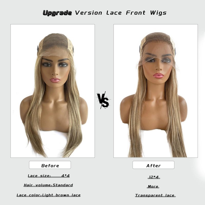 Upgrade - 12*4 Straight Highlight Lace Front Human Hair Wigs , 100% Real Human Hair for Women,4T12/613 Medium Brown Roots to Golden Brown with Blonde HD Lace Wigs,Pre Plucked with Bleach Konts