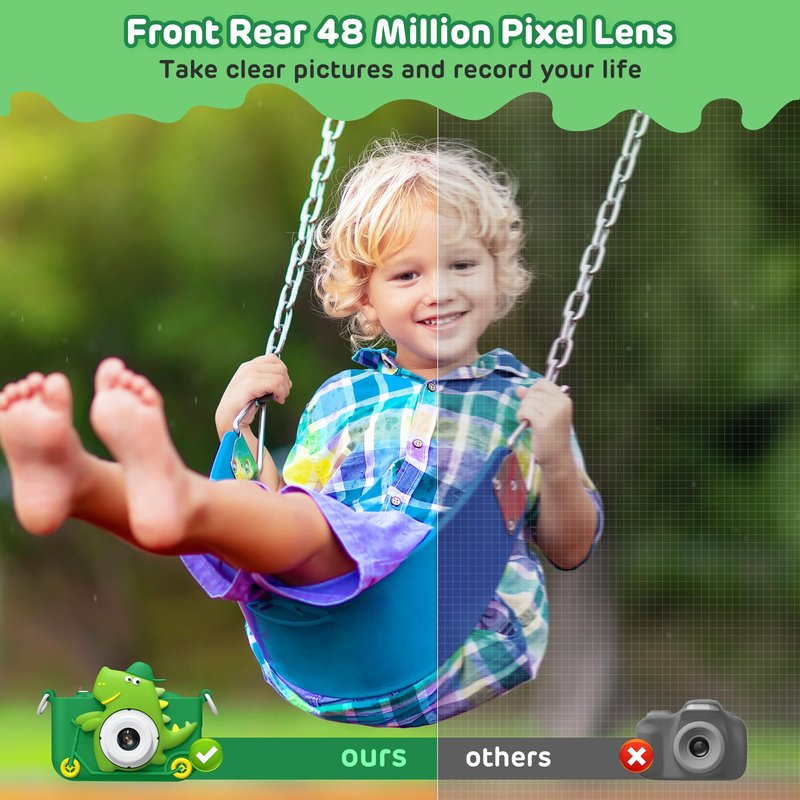 - 【Upgraded Specially Design for Children】Upgraded to dual-camera configuration, Easy to take selfies. Just open the switch key to enjoy the fun of taking photos. The cute dinosaur cartoon soft silicone casing provides the toddler camera with anti-drop design, allows kids to enjoy happy and freedom photography moments without worries of broken. The digital camera for kids also specially designed a durable lanyard for portability, children can hang the camera on their neck, makes this toy easy to use outdoor for 3-12 years old boys girls.
