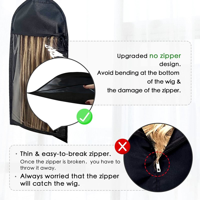 - Improved Design: You must feel very frustrated with this annoying situation, the wig is pinned by the zipper! Thanks to Koobay for innovating the hair extension storage bags with wooden hangers design, which helps us solved this problem! Compared with the general design of the zipping up and down, it goes to add an opening at the bottom of the product, keep your hair shape free and be protected.
