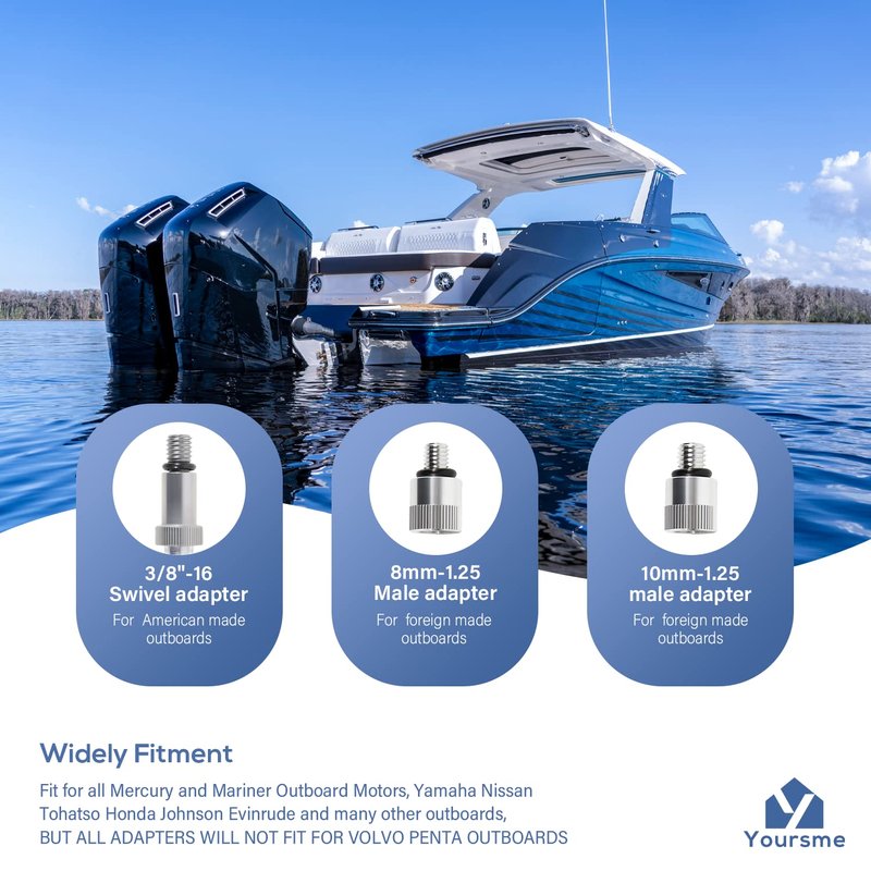- 3/8"‑16 Swivel adapter fits for all Mercury and Mariner Outboard Motors and other American made outboards.