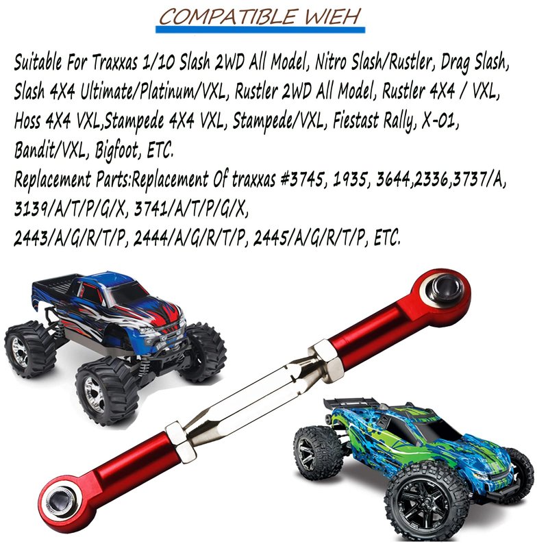 - 【Universal Compatibility】Slash 2wd Adjustable Upgrade Parts Turnbuckles/Camber Links could be compatible with Traxxas 1/10 Slash 4X4 / 2WD Short Course Racing Truck RC Car,Rustler 4X4 VXL,Nitro Slash,Slash 2WD Unassembled Kit,Slash 4X4 Ultimate,Slash 4X4 Platinum,Slash 4X4 VXL,Slash VXL,Stampede 4X4 VXL,Stampede VXL,Hoss 4X4 VXL.Replacement for Traxxas #3745 3139 3139A 1935 3644 3741X 3741A.(Note: If the connecting rod screw is loose, fix the connecting rod on the car shelf and tighten the screws to solve the loosening problem.)