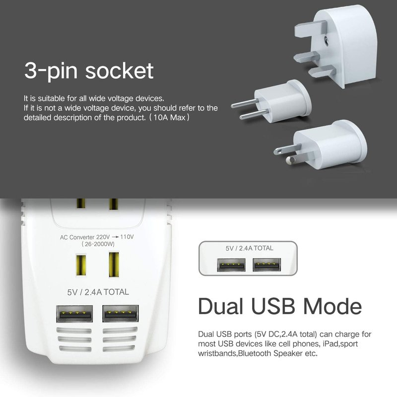 - ✈✈✈【Designed for Travel】Light to carry and very quiet when used. All-in-one plug design doesn’t take up more space--the lightest trip helper in your luggage! Do not worries about the devices voltage and charging issues anymore while you’re outside US and travel on any country that rated at 220V.