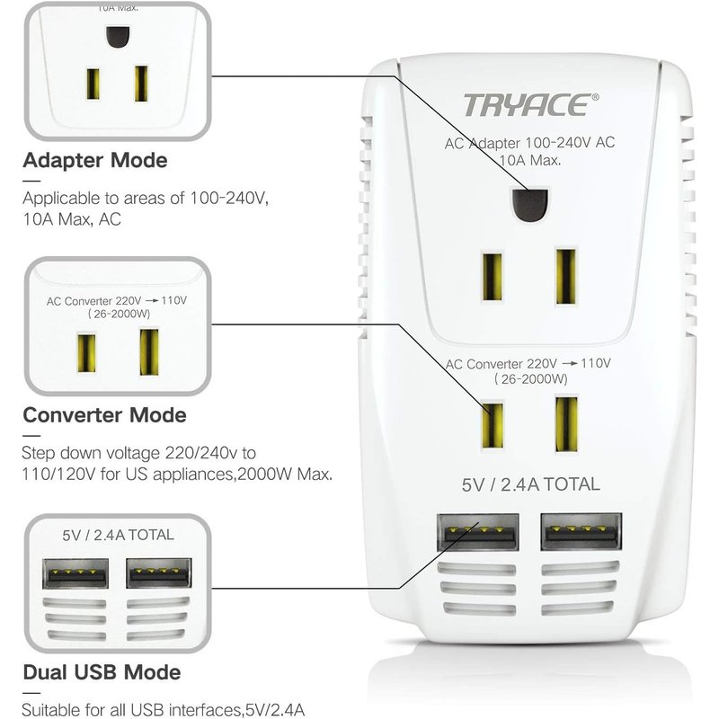 - ✈✈✈【Upgraded Converter for 110-120V Devices】The TryAce voltage converter (2-prong AC Socket) can convert the voltage from 220-240V to 100-120V for American appliances, which is suitable for all brands of hair dryers(except Dyson). The converter is suitable for Conair/ Revlon/ BaBylissPRO hair styler, such as hair straightener/flat iron/curling iron. It can also be used for mechanical control equipment such as electric kettles.
