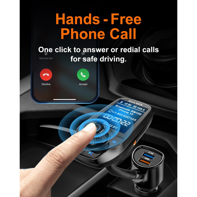 With UL Approved, Guanda’s 4in1 Bluetooth FM Transmitter for Car, you can drive safely. Answer, hang up, reject a call, redial the last number, and pick your favorite song all from one easy to use display.
