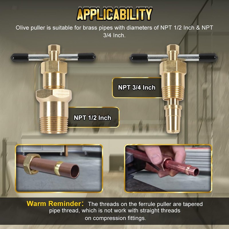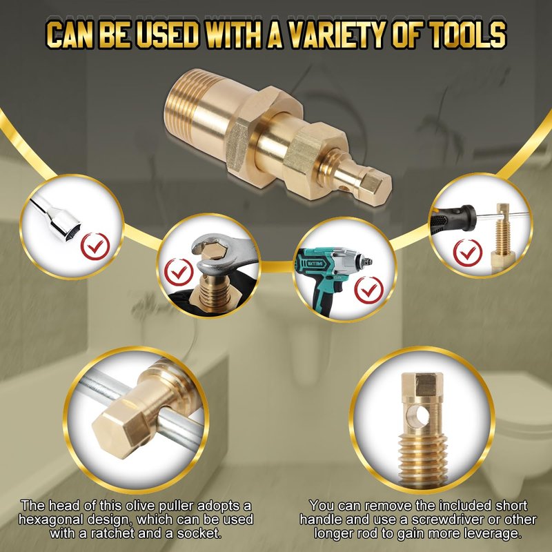 - 【Easy to Operate & No Damage to The Pipe】Olive puller removal tool is a reliable plumbing tool. It works by screwing the olive puller into the valve nut, then turn the handle, the ferrule puller applies constant and even pressure against pipe and the threaded compression, sliding the compressed ferrule toward the open end of the pipe without damaging the integrity of the pipe itself, and then fall off. It's safer to operate and won't cause further damage than tools like pliers or hack saws.