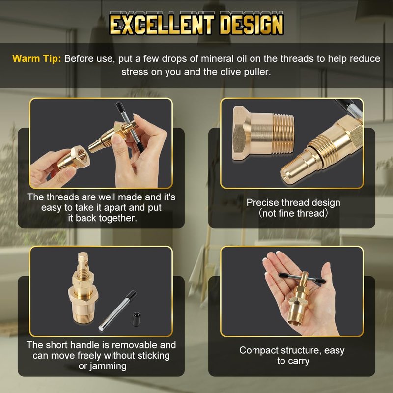 - 【Well Made & Compact Structure】The design of the compression ring removal tool ensures precision and ease of use. It is made of high-quality solid brass with well-made threads, high strength/hardness, sturdy and durable, and has good corrosion and wear resistance. The olive puller features premium construction and compact size, and the handle and threads move freely without sticking or jamming. Small enough to hold in one hand, it works great even in very tight spaces.