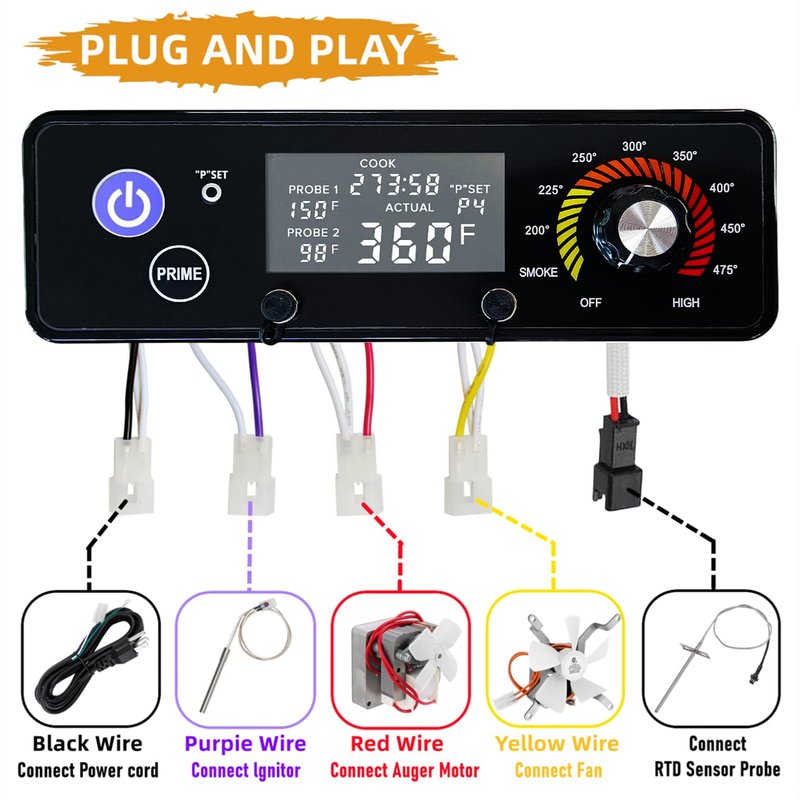 - ⚙️【𝐓𝐫𝐮𝐞 𝐏𝐥𝐮𝐠 𝐚𝐧𝐝 𝐏𝐥𝐚𝐲】You just need to put the original control board out, prepare a controller replacement parts for pit boss, then match the wire colors on each plug, an orange wire connects the fan, a red wire connects the auger motor, a purple wire connects ignitor, and a black wire connects the power in. So the entire installation is plug and play, just matching colors.