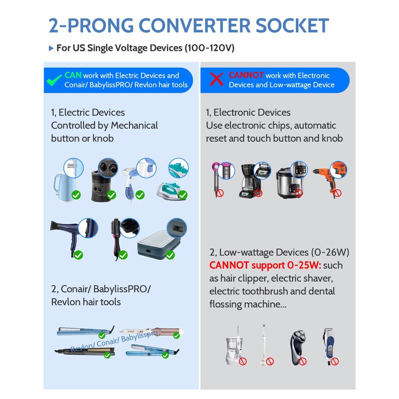 - 【Newest Upgraded Converter for 110V/ 120V Devices】2-prong AC converter socket can step down foreign voltage from 220-240V to 110V/120V, designed for US standard devices when Americans travel to 220-240V countries, such as Conair/ Babylisspro/ Revlon hair styling tools (hair straightener, flat iron, curling iron) and hair dryers (except Dyson), steam irons, electric kettle etc.