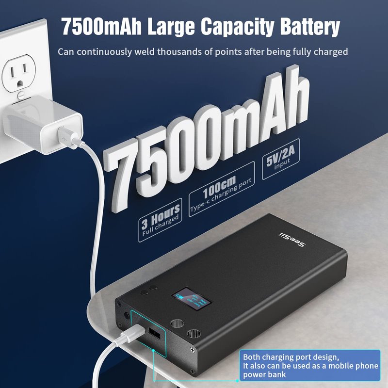 - ★【Built-in 7500Mah Rechargeable Battery】:Seesii portable spot welder built in 7500mAh high-rate rechargeble polymer lithium battery,with type-C charging cable,can be fully charged within 3 hours, and it can continuously weld thousands of points after being fully charged.What's more, if you need to it charge to your phone,the mini welder tool can be used as a power bank.