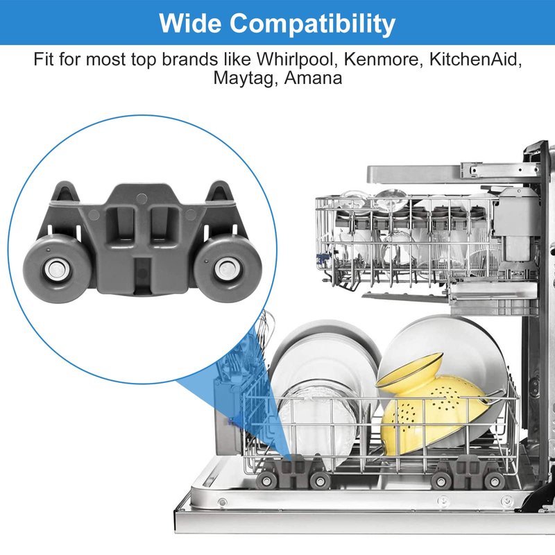 Improved Dishwasher Wheels Lower Rack-W10195416V Park of 4 kitchenaid Dishwasher rack wheels,Upgraded W10195416V lower dishwasher wheel further Improved the product with rust-resistant 304 screws to ensure the durability and longevity of the kenmore dishwasher replacement parts. Maytag dishwasher rack wheels redesigned reinforced wheel,will certainly hold up better under the heavier weight of the bottom dishwasher rack.