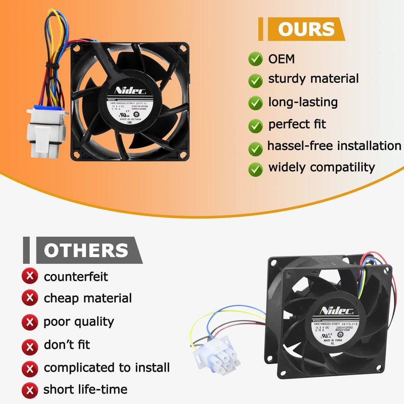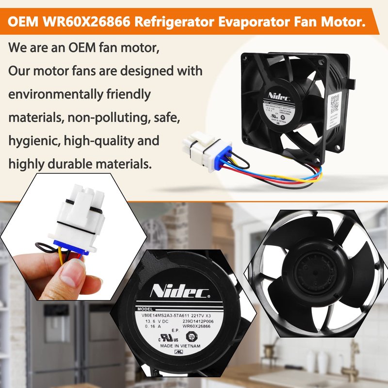 - 【Product Advantage】: OEM WR60X26866 Refrigerator Evaporator Fan Motor. Our motor fans are designed with environmentally friendly materials, non-polluting, safe, hygienic, high-quality and highly durable materials, ensuring that there is no problem before shipping to customers, ensuring that customers receive a complete product.