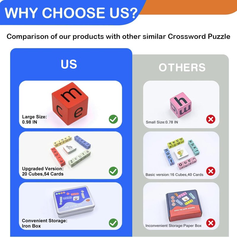 - 【Upgrade Version】Matching letter game for kids comes with 1 iron storage box, 20pcs upgrade large letter cubes, 54pcs flash cards with cute illustrations.