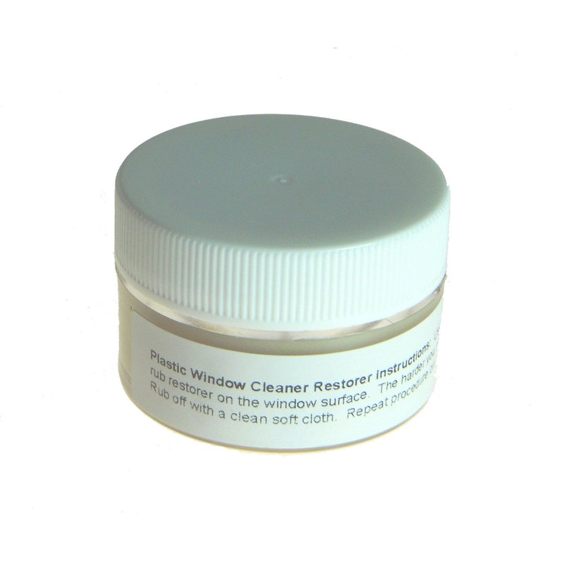 1 once container of soft top window cleaner restorer erases yellow oxidation, scratches, and hazy foggy film from plastic convertible top windows. Rub on and wipe off. It takes some hard rubbing, but works great.