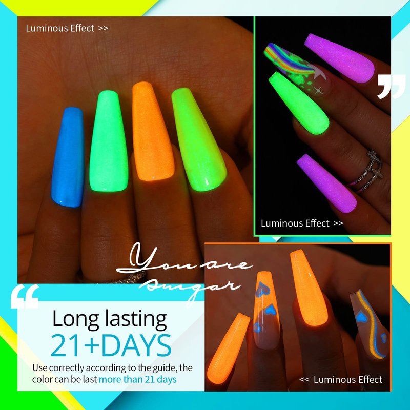 - LONG LASTING: The Glow in the Dark Neon Luminous Colors nail gel polish set is highly pigmented and have good tenacity. with proper application, not easy to peel off and no chipping, can keep about 3 weeks long lasting. Provide shiny glossy and smoothly matte effect.