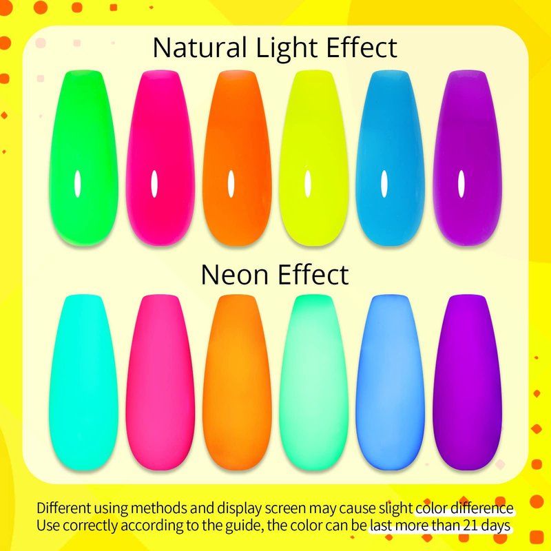 - 【Neon Poly Extension Gel Nail Box】- UR SUGAR neon poly extension gel nail polish set come with 6 popular and trendy colors (Hot Pink Neon Green Yellow Orange Blue Purple, they are NOT with two greens, colortone numbers are different. Green is URE08 Yellow is URE11).