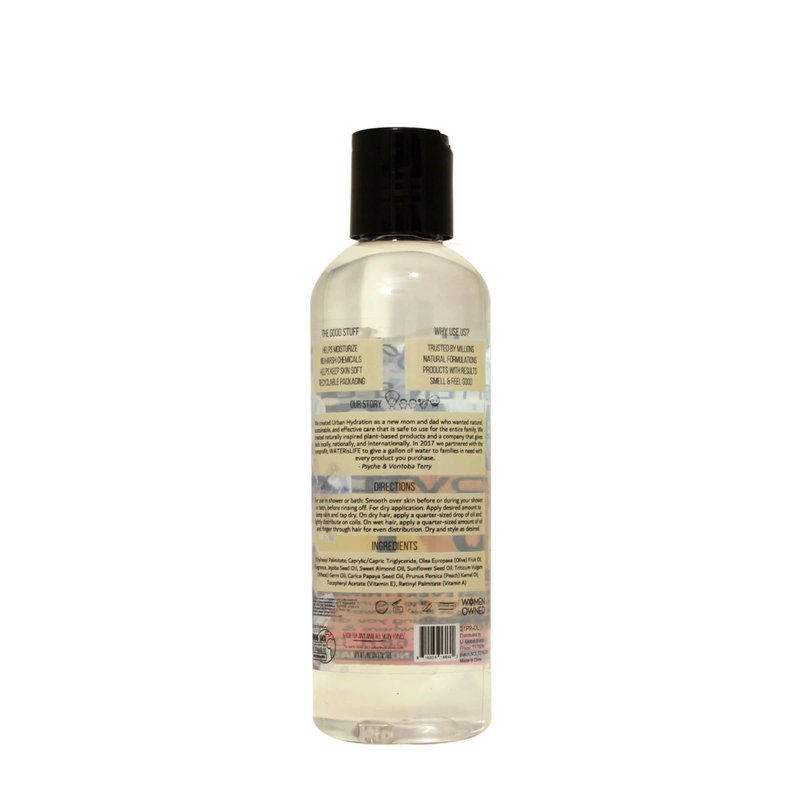 Why use everything oil? Give your skin and hair the nourishment & moisture it's been missing in the shower or both. Our everything oil is everything you didn't know you needed! Use if everywhere & anywhere. No parabens. No silicones. No phthalates. No sulfates. The Good Stuff: Helps moisturize, no harsh chemicals, helps keep skin soft, recyclable packaging. Why use us? Tursted by millions natural formulations products with results smell & feel good. Our Story: We created Urban Hydration as a new mom and dad who wanted natural, sustainable, and effective care that is safe to use for the entire family. We created naturally inspired plant-based products and a company that gives back locally, nationally, and internationally. In 2017 we partnered with the nonprofit, waterislife to give a gallon of water to families in need with every product you purchase. Psyche & Vontoba Terry. Good for any and all skin tones! urbanhydration.com. (hashtag)NatureUniteUs. For questions please contact use at customerlove(at)urbanhydration.com. To learn more visit urbanhydration.com. Giving back for every product sold we donate to WaterisLife. Women owned. Made in China.