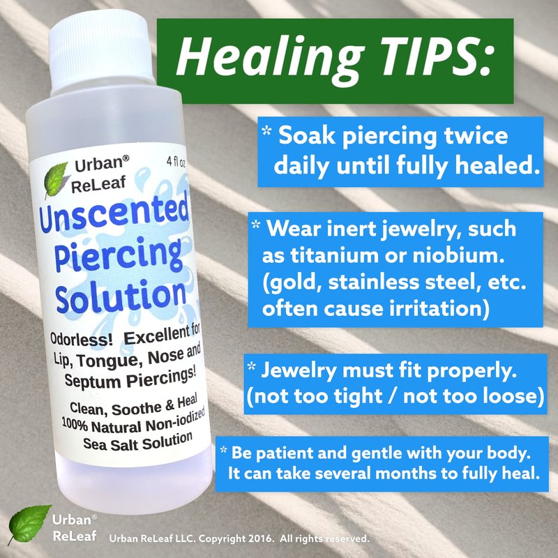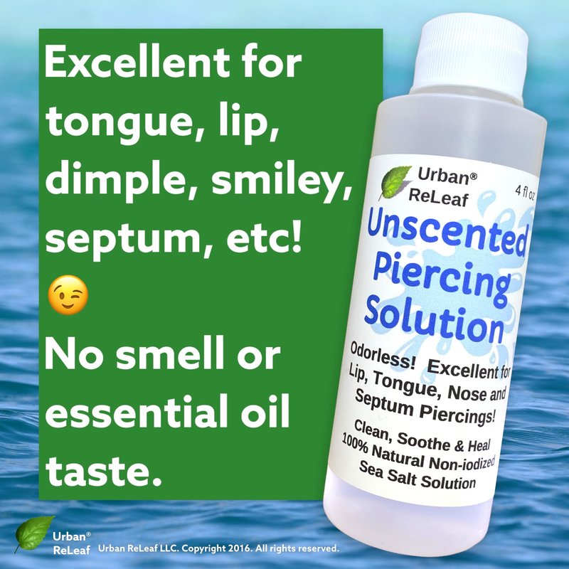 - Urban ReLeaf Unscented Piercing Solution ! Healing Sea Salts Non-Iodized Sea Salt Soak. Odorless! Excellent for Lip, Tongue, Nose & Septum. 4 oz, Ready to use. Gentle Soothing Natural. TRUSTED & RECOMMENDED BY PIERCERS! "THE FINEST AFTERCARE AVAILABLE"! Urban ReLeaf UNSCENTED PIERCING SOLUTION - the natural solution to heal your piercings! Medicated Sea Salt soaks are the best thing you can do for a new, stretched or angry piercing.